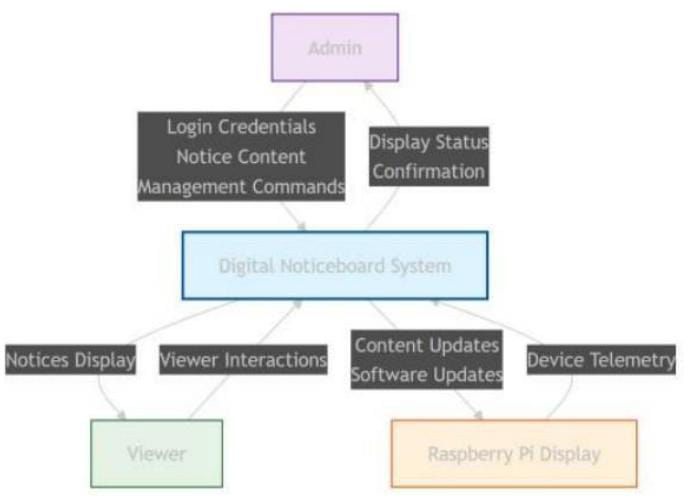 Traditional notice boards are widely used in educational institutions for displaying announce- ments and important information. However, these systems require manual updates and often result in delayed communication, paper waste, and limited accessibility. Several digital notice board solutions have been proposed using technologies such as GSM modules, Arduino microcontrollers, and NodeMCU boards. Despite these developments, many existing systems suffer from limitations such as restricted display capabilities, lack of centralized control, limited multimedia support, and inadequate security mecha- nisms. This research proposes a next-generation IoT- based digital notice board system designed to deliver secure, real-time information updates across multiple display units. The system integrates a web-based ad- ministrative dashboard built with React.js, a Node.js and Express.js backend for handling API services, and a MongoDB cloud database for storing notice meta- data. Media files are securely hosted using cloud stor- age services and delivered to display devices through real-time communication using Socket.io. Raspberry Pi devices configured in kiosk mode act as display endpoints capable of rendering dynamic multimedia content. Additionally, the system incorporates inter- active features such as QR-code based mobile access, gesture navigation using sensors, voice alerts for im- portant notices, and hybrid connectivity mechanisms including Wi-Fi and Bluetooth to ensure continuous operation even during network interruptions. Experi- mental evaluation demonstrates improved scalability, secure communication, and faster notice propagation compared with traditional microcontroller-based dig- ital notice board systems.