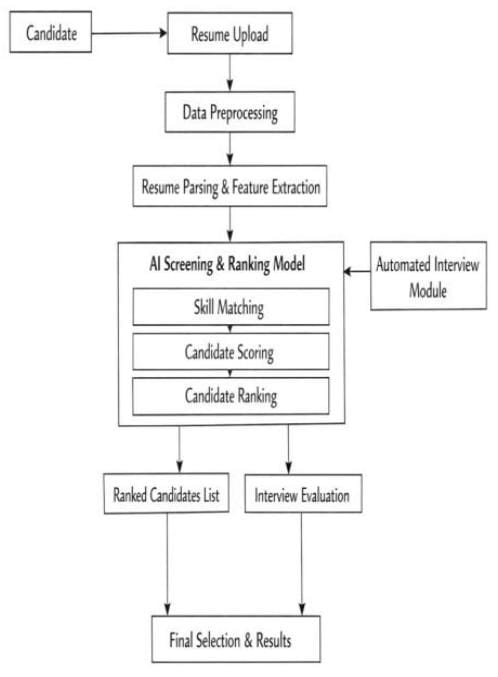 The recruitment process in many organizations involves reviewing a large number of resumes to identify suitable candidates for job positions. This manual screening process is time-consuming, labor-intensive, and often prone to human bias, making it difficult for recruiters to efficiently evaluate all applications. To address these challenges, this study proposes an AI-powered automated resume screening and interview system that utilizes advanced machine learning and natural language processing techniques to analyze resumes and assist in the recruitment process. The system is designed to automatically extract relevant information such as skills, qualifications, work experience, and keywords from candidate resumes and match them with job requirements to determine the suitability of applicants.The proposed system incorporates multiple machine learning and artificial intelligence approaches, including text preprocessing, feature extraction, and classification algorithms to evaluate candidate profiles. Natural Language Processing (NLP) techniques are used to process and interpret textual information present in resumes, while machine learning models analyze the extracted features to classify and rank candidates based on their compatibility with the job description. Additionally, the system includes an automated interview module that generates relevant interview questions and evaluates candidate responses, further assisting recruiters in shortlisting qualified applicants.By integrating artificial intelligence with recruitment processes, the proposed system aims to significantly reduce the time and effort required for resume screening while improving the accuracy and fairness of candidate selection. The automated evaluation and ranking mechanism helps recruiters identify the most suitable candidates efficiently and supports data-driven decision-making in hiring processes. The implementation of such an intelligent recruitment system has the potential to streamline hiring workflows, minimize human bias, and enhance the overall efficiency of talent acquisition in modern organizations.
