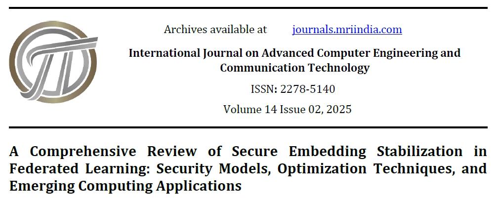 Clark, J. M., Andersson, R., & Moreau, S. (2025). A Comprehensive Review of Secure Embedding Stabilization in Federated Learning: Security Models, Optimization Techniques, and Emerging Computing Applications. International Journal on Advanced Computer Engineering and Communication Technology, 14(2), 174–180. Retrieved from https://journals.mriindia.com/index.php/ijacect/article/view/2032