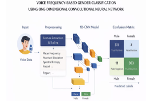 Voice-based gender classification is a fundamental task in speech processing with applications in biometric systems, human–computer interaction, and demographic analytics. This study proposes an efficient deep learning approach for gender recognition using frequency-domain acoustic features. A structured dataset comprising 21 statistical voice features is employed to train a one-dimensional Convolutional Neural Network (1D CNN). Unlike conventional approaches that rely on raw audio or spectrogram representations, the proposed method operates directly on pre-extracted frequency features, thereby reducing computational complexity while preserving discriminative information. The dataset is preprocessed through label encoding and feature standardisation before being fed into the model. The trained network achieves a test accuracy of 97.00% and an AUC score of 1.00, demonstrating excellent classification capability. The results confirm that structured acoustic features, when combined with deep learning, provide a robust and scalable solution for voice-based gender classification.