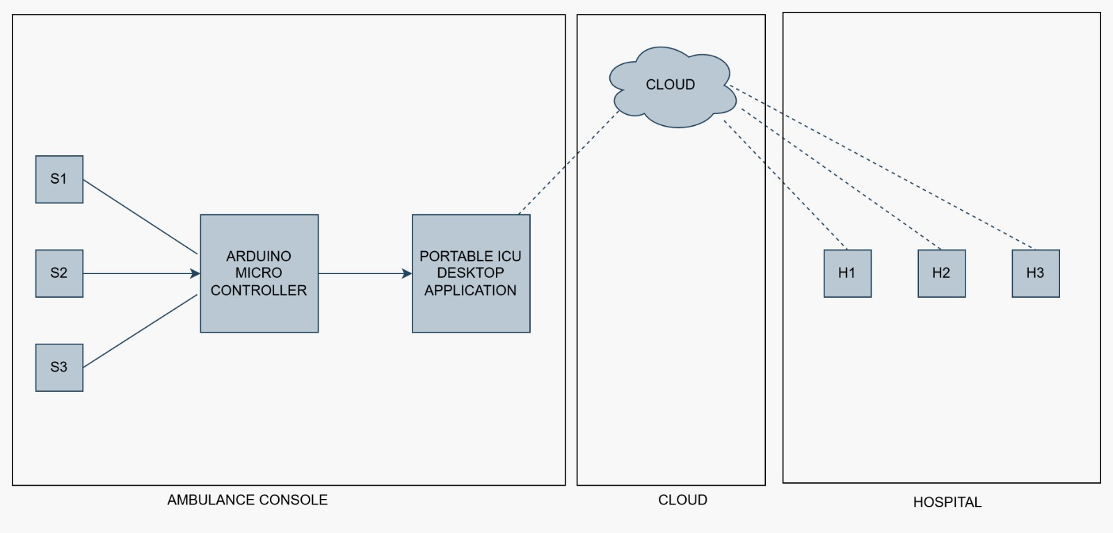 The Human-Centric Cloud-Based Portable ICU system represents a transformative approach to emergency medical care by seamlessly integrating real-time ambulance assistance with hospital infrastructure through advanced IoT technologies. This innovative system enhances patient outcomes by optimizing the coordination between emergency medical services and healthcare facilities. Portable medical devices equipped with IoT sensors measure key health parameters, such as body temperature, heart rate, pulse rate, and SpO2 levels, allowing first responders to quickly assess a patient’s condition. These devices facilitate the creation of a unique patient ID, consolidating all pertinent medical information and ensuring efficient data handling from the initial ambulance encounter. All collected data is securely transmitted via robust communication protocols like MQTT and cellular networks to a centralized cloud database. This cloud-based hub serves as an information exchange point between ambulances and hospitals. Upon receiving data, hospitals are immediately notified of the incoming patient's condition, enabling them to assess their capacity to provide appropriate care based on available beds, doctors, and specialized medical infrastructure. Real-time analytics and dashboards provide actionable insights, allowing hospitals to rapidly communicate their readiness and availability back to the ambulance crew, directing the patient to the most suitable facility without delay. By establishing a robust communication loop between ambulances and hospitals using IoT-enabled devices and cloud computing, this system significantly reduces the time taken for patients to receive critical care. The integration of emergency services with hospital management systems through a secure and efficient data-sharing platform streamlines the decision-making process, improving the efficiency of patient transfers. Overall, this system exemplifies the potential of IoT technology to revolutionize emergency healthcare delivery, ensuring that patients receive timely and appropriate medical attention during critical situations.