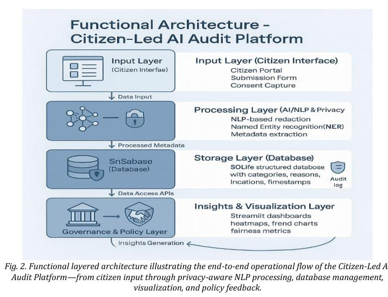 A conceptual framework and layered functional architecture are proposed to integrate citizen reporting, NLP-based anonymization, structured metadata storage, and visualization dashboards for systemic bias detection. The study bridges theoretical Responsible-AI principles with practical citizen-centric accountability models, offering a scalable foundation for participatory and ethical AI governance.