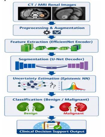 Artificial Intelligence Techniques for Segmentation and Classification of Renal Tumors Using EfficientNet-Based U-Net and Epistemic Neural Networks: Trends and Challenges