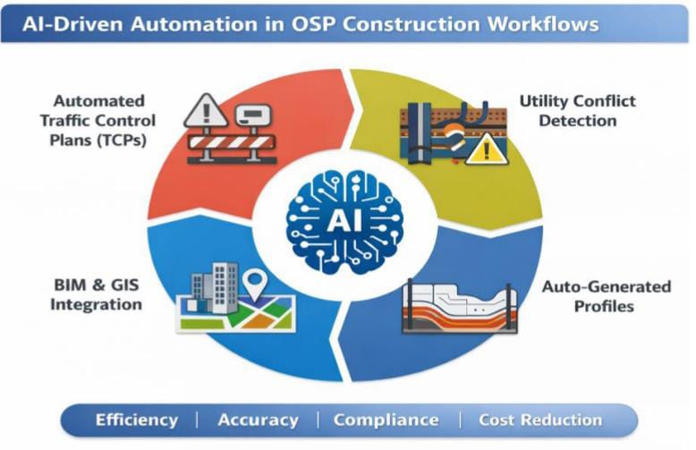 The growing complexity of the telecommunications infrastructure thanks to the introduction of 5G and 6G networks densification has exerted more pressure on the conventional Outside Plant (OSP) design processes, unlike ever before. Traditional manual drafting and field verification processes tend to be very laborious, time wasting, and with a high possibility of human error. The paper is a critical evaluation of the state of AI-driven automation in construction drawings of OSP, whether it is a real technological advancement or a hype in the industry. With the help of a mixed-method research design, the study will carry a systematic literature review and a benchmarking performance analysis of the manual and AI-assisted workflows. The study is about 3 fundamental applications, including automated Traffic Control Plans (TCPs), AI-based utility conflict identification, and auto-generated longitudinal and cross-section profiles. The design cycle time, frequency of errors, and the cost efficiency were considered as key performance indicators (KPIs). It is shown that the use of AI helps to save a lot of time on drafting and improve subsurface utility conflict prediction. In particular, automatically generated TCPs and profile generation generated immediate productivity and regulatory consistency improvements. Nevertheless, there are constraints on the reliability of data and the need to have human validation due to the complex conditions of sites. The paper concludes that, despite huge benefits of AI, human engineering skills cannot be fully replaced by AI. It is suggested that a hybrid human-AI collaboration scheme would be the most effective in providing the greatest design effectiveness, safety, and adherence to changing regulations. These findings offer a sensible roadmap to the industry stakeholders as far as the implementation of intelligent design technologies is concerned.